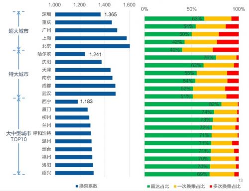 《报告》指出,从搭乘公交的便捷度看,超大城市的换成系数普遍高于特大城市,而特大城市又普遍高于大中城市。在超大城市中,深圳公交的换乘系数最小;哈尔滨、西宁公交的换乘系数分别在特大和大中型城市中最小。
