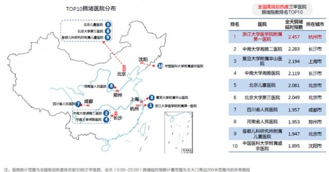 《报告》还公布了三季度中国主要三甲医院“拥堵”榜单。在全国规划热度最高的前30所三甲医院中,浙江大学医学院附属第一医院周边道路拥堵最严重,全天拥堵延时指数高达2.457。上榜前十的医院中:北京市有3所医院上榜,长沙有2所医院上榜,上海、成都、郑州、沈阳各有1所医院上榜。