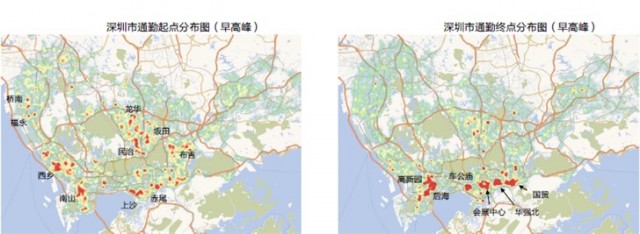 《报告》还分析了深圳潮汐通勤起终点分布情况。以2019Q3期间深圳市早高峰通勤为例,从深圳市总体来看,早高峰通勤起点相对分散;而通勤终点相对集中,主要集中在深圳市南部的几个片区。早高峰通勤起点分布相对密集区域,如西乡、南山、上沙等地;通勤终点则主要集中在高新园、后海等地。