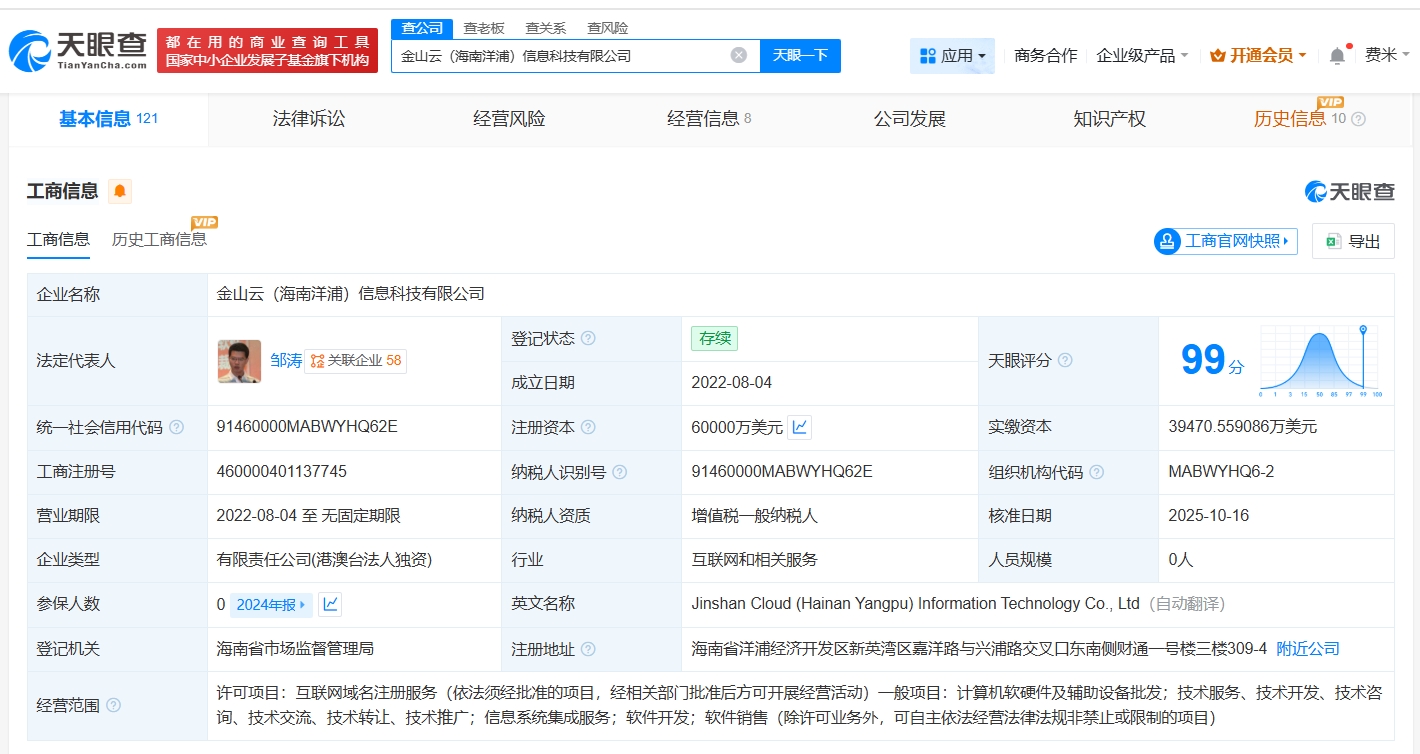 该公司成立于2022年8月,法定代表人为邹涛,经营范围包括互联网域名注册服务、计算机软硬件及辅助设备批发、信息系统集成服务等,由金山云有限公司全资持股。