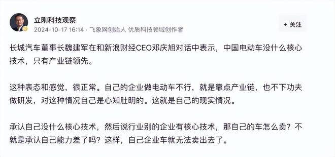 这样的观点马上就遭到了央视评论员项立刚的痛批,他认为长城汽车董事长魏建军贬低中国电动汽车的核心技术,其实就是为了掩饰自己的无能。自己做不好企业,却拉上整个同行“背锅”。