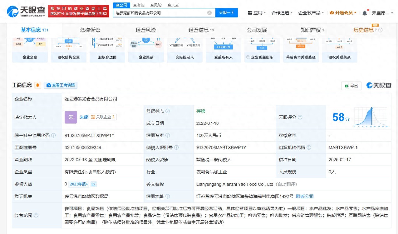 天眼查App显示,连云港鲜知肴食品有限公司成立于2022年7月,法定代表人为朱娜,注册资本100万人民币,经营范围包括水产品批发、水产品零售、水产品冷冻加工、食用农产品零售等,由朱娜全资持股。年报信息显示,该公司2023年0人参保。