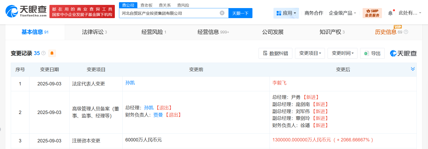 天眼查工商信息显示,近日,河北自贸区产业投资集团有限公司发生工商变更,注册资本由6亿人民币增至130亿人民币,增幅约2067%,同时多位主要人员也发生变更。