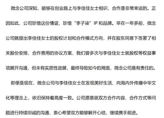 综合其发布的内容可以看出,其实微念一方还是更愿意与李佳佳和解,维持原本的合作关系,并表示未曾控制过任何李子柒的相关账号,愿意持续坦诚沟通,解开心结。
