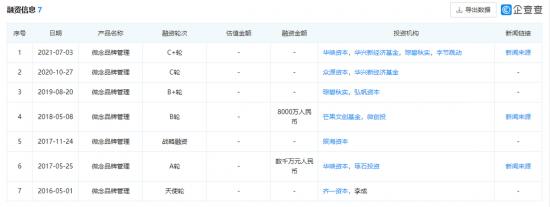 另一方面,与李佳佳合作后,随着李子柒这个IP越做越大,微念这个公司也被越来越多的人注意到。据天眼查融资历程显示,微念至今已完成5轮融资,2018年以来的融资中,投资方包括新浪微博、芒果文创基金等。在最近2021年7月份的融资中,还可以看到字节跳动的影子,自此杭州微念的市场估值一度高达50亿元。据开菠萝财经报道,微念50亿的估值是从一家新消费公司的角度给的,机构根据品牌的销售额,按照这两年消费赛道常规PS值3-10倍给到估值。