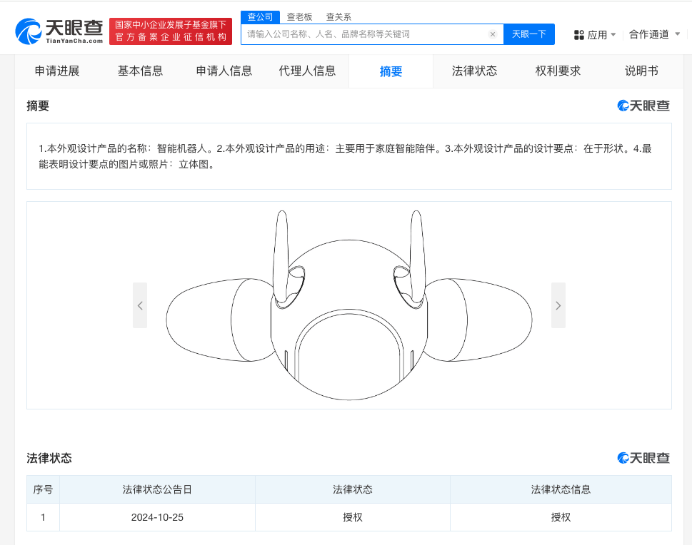 天眼查知识产权信息显示,近日,科大讯飞股份有限公司申请的“智能机器人”外观专利获授权。摘要显示,该外观设计产品的名称为智能机器人,主要用于家庭智能陪伴。