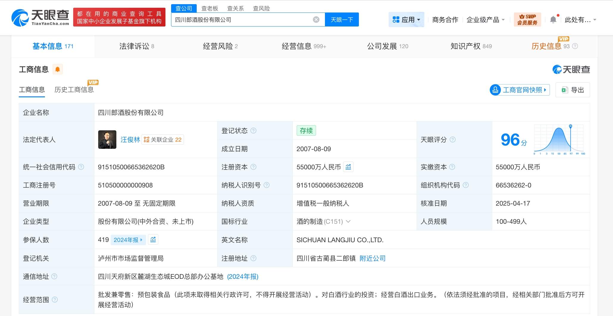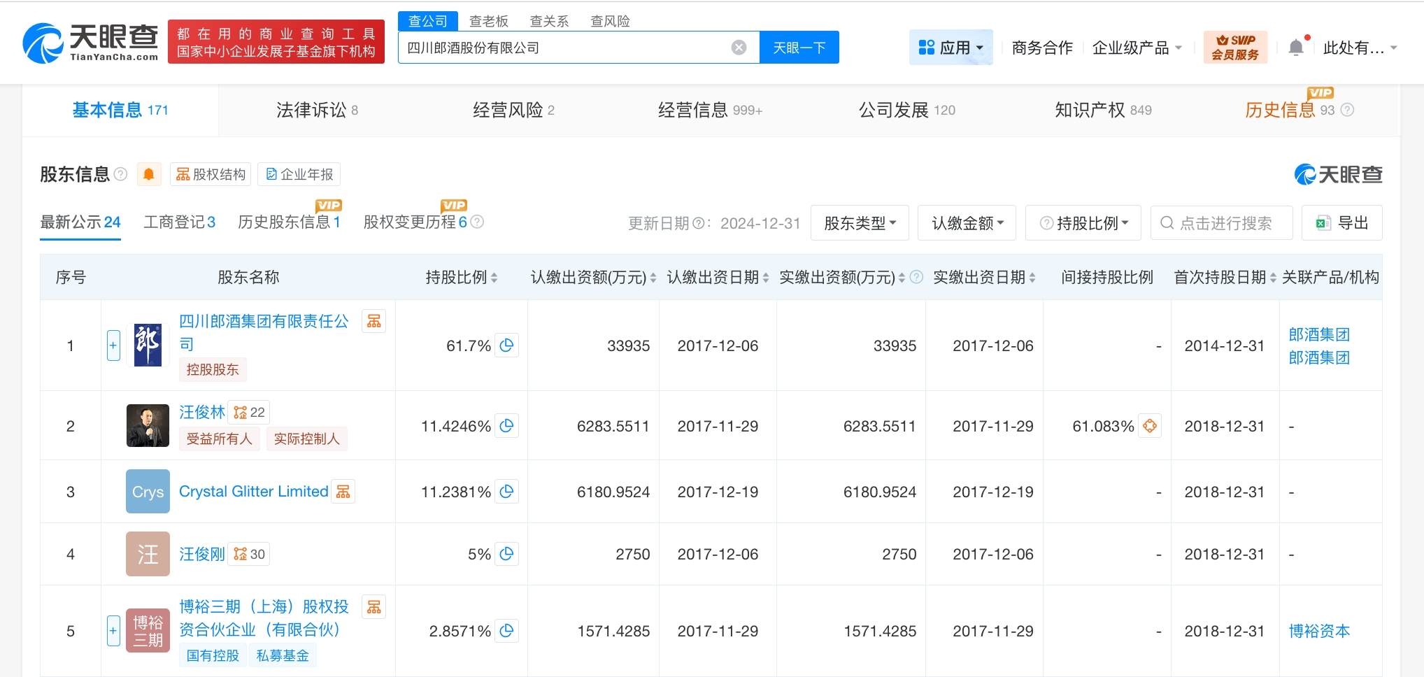 四川郎酒股份有限公司成立于2007年8月,法定代表人为汪俊林,注册资本5.5亿人民币,经营范围包括批发兼零售:预包装食品,对白酒行业的投资,经营白酒出口业务。股东信息显示,该公司由四川郎酒集团有限责任公司、汪俊林、Crystal Glitter Limited等共同持股。