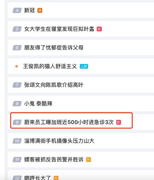 继猿辅导单日加班超6小时的热搜后,今日,造车新势力之一的蔚来,又因高强度加班冲上热搜前十。