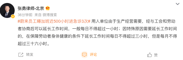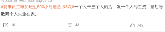 热搜信息显示,有网友爆料,其入职蔚来汽车三年,经常加班。半年内有文档证据的加班就500小时。