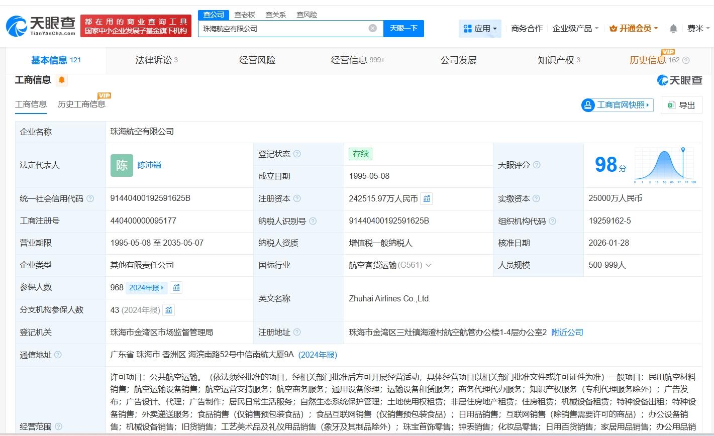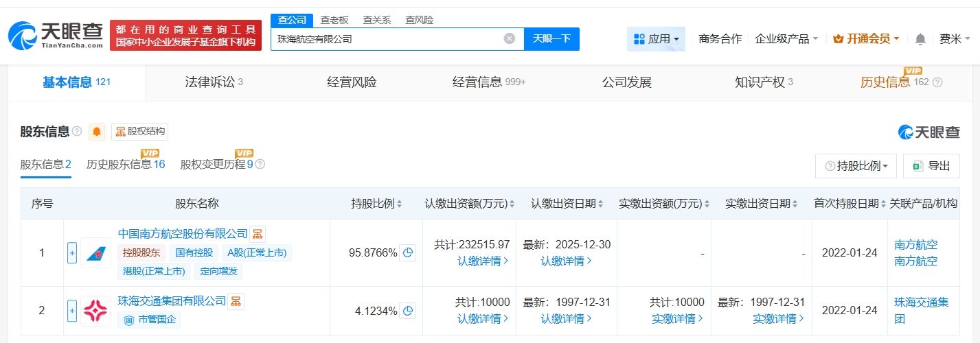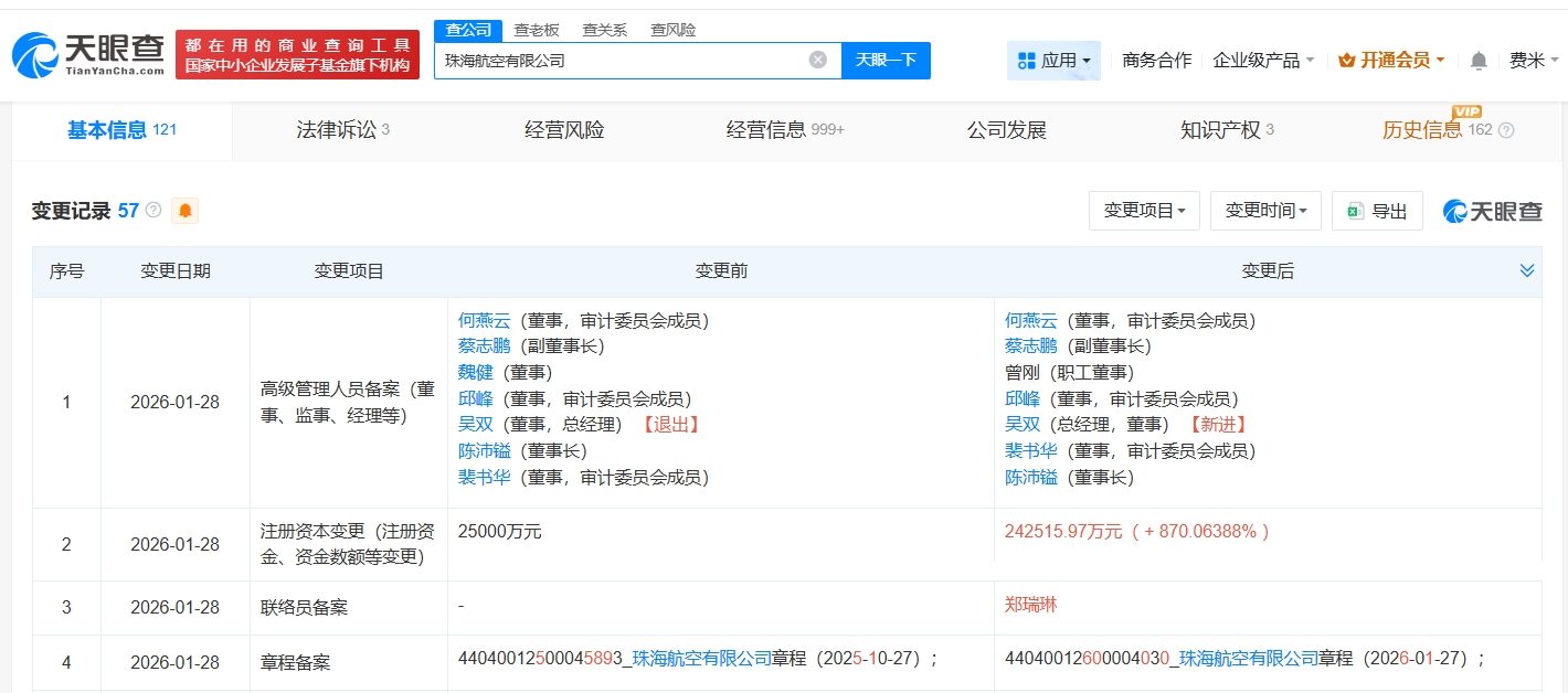天眼查App显示,近日,珠海航空有限公司发生工商变更,注册资本由2.5亿增至约24.3亿人民币,增幅约870%。
