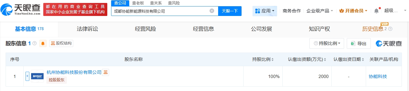 天眼查App显示,近日,成都协能新能源科技有限公司成立,法定代表人为ZHOU XUN WEI,注册资本2000万人民币,经营范围包括新兴能源技术研发、信息系统集成服务、信息系统运行维护服务、电池销售等。股东信息显示,该公司由杭州协能科技股份有限公司全资持股。