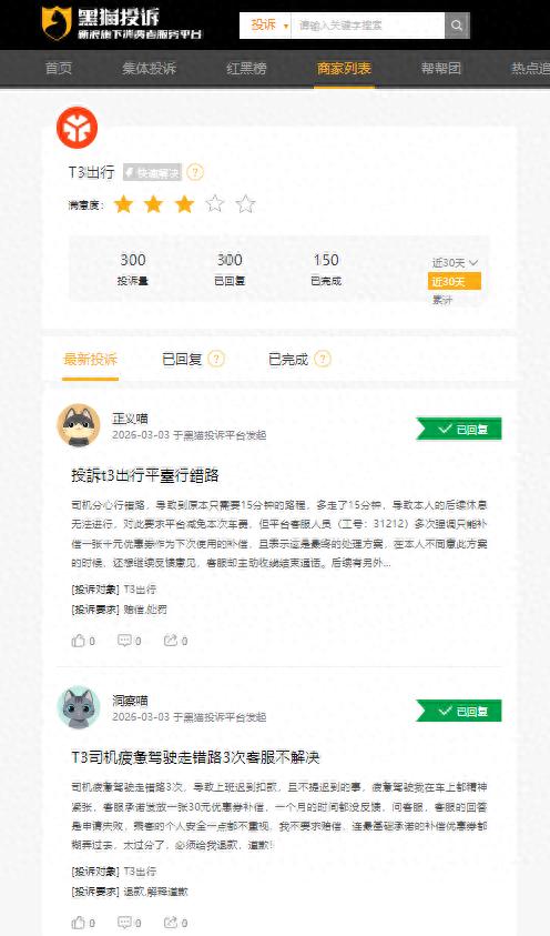 近期,关于T3出行的投诉在各大平台持续发酵,违规收费、无证运营、客服不作为等乱象频发。仅黑猫投诉平台,关于T3出行的投诉密密麻麻,仅近30天内,相关投诉就达300条,海量投诉背后,是司乘双方合法权益接连受损。