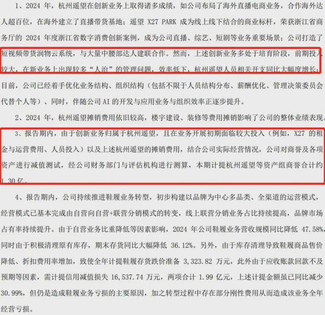 在2024年财报中,遥望科技已经详细总结了公司亏损的原因,除了已基本剥离的原女鞋主业还在拖累外,多和企业所谓的创新相关。遥望科技指出,相关创新业务多处于培育阶段,前期投入较大,在新业务上出现较多“人治”的管理问题,效率低下,杭州遥望人员相关开支同比大幅度增长。