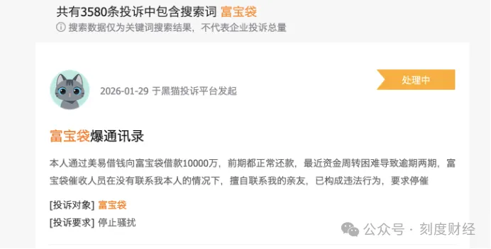 黑猫投诉平台上,关于富龙小贷“高利贷”“隐性收费”“暴力催收”的投诉比比皆是。截至2026年2月25日,其核心产品“富宝袋”相关投诉已达3500余条,其中多数涉及利率过高、隐性收费、暴力催收、拒绝提前结清、拖延开具结清证明等问题。