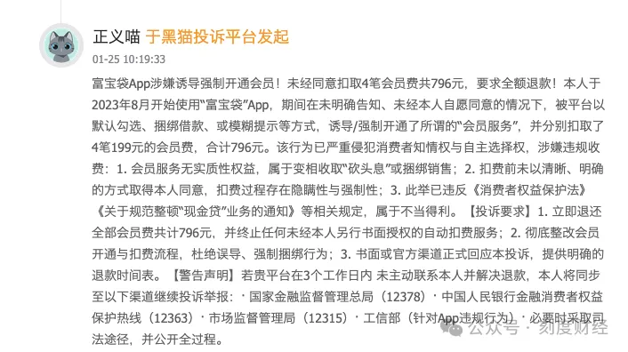 有用户在黑猫投诉表示,自己于2023年8月开始使用“富宝袋”App,期间在未明确告知、未经本人自愿同意的情况下,被平台以默认勾选、捆绑借款、或模糊提示等方式,诱导强制开通了所谓的“会员服务”,并分别扣取了4笔199元的会员费,合计796元。 其认为,该行为已严重侵犯消费者知情权与自主选择权,涉嫌违规收费。