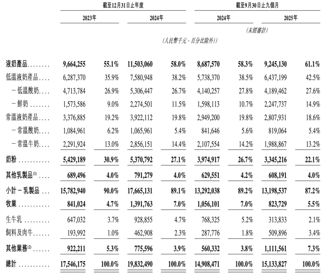 君乐宝已在这一赛道建立起显著优势。2024年,“悦鲜活”成为高端鲜奶第一品牌,“简醇”是低温酸奶第一品牌。低温产品已成为公司主要增长引擎,营收占比从2023年的55.1%提升至2025年前三季度的61.1%。