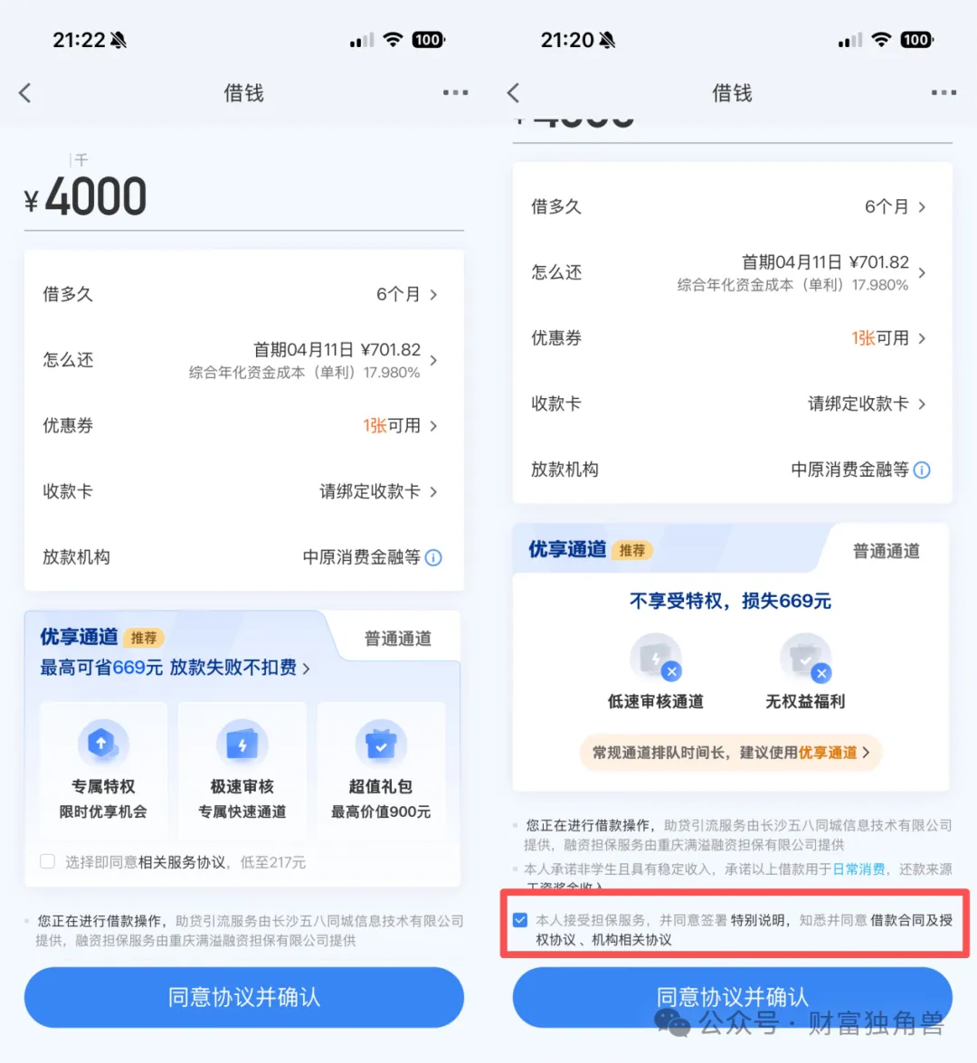 而真正的“利润放大器”则来自第三方公司,如前述的上海闪态网络技术有限公司,以及中融信等各类融资担保公司。这些第三方公司以提供“信息咨询”、“信用担保”、“会员权益”为名,与借款人签订独立协议,通过支付通道直接代扣“担保费”、“优享卡费”。