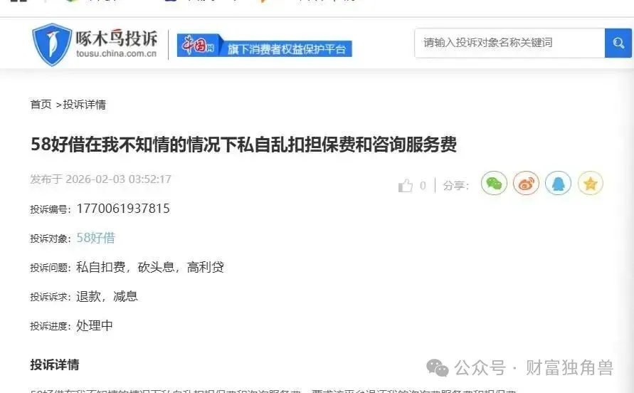 正是这种“费用拆分+第三方代扣”的模式,为58好借招致了海量的用户投诉。