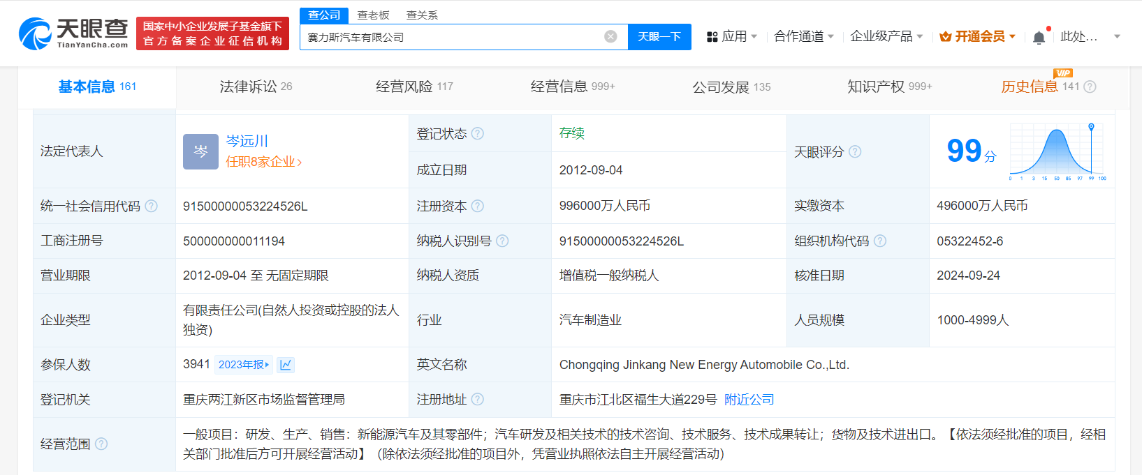 天眼查App显示,近日,赛力斯汽车有限公司发生工商变更,注册资本由49.6亿人民币增至99.6亿人民币。