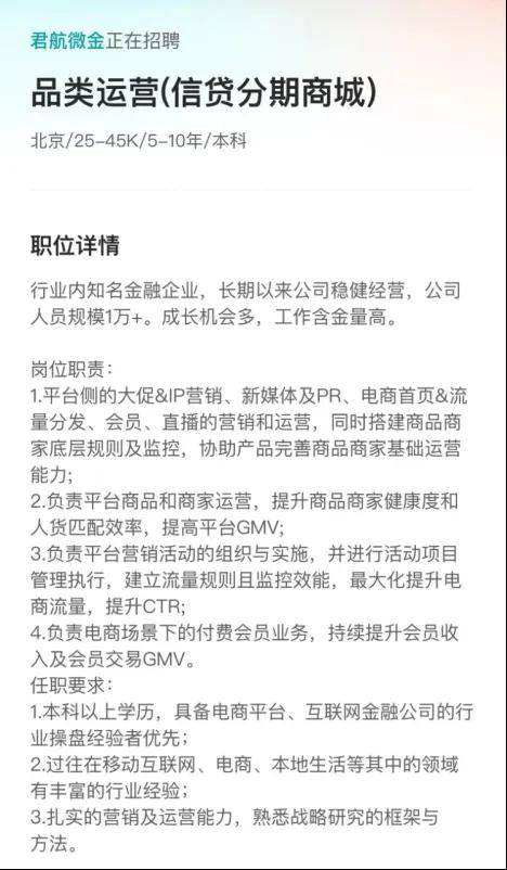 结合君航微金高薪招聘信贷分期商城品类运营岗位这一事件,更加深了外界的猜测。该岗位需要负责平台商品和商家运营,以及电商场景下的付费会员服务等,这似乎在为恒小花开展分期商城业务做准备。