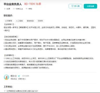 在该招聘的职位描述中,君航微金对恒生活进行了简单介绍——恒生活是一家专注“智能硬件”的平台型公司,业务方向包括无人零售、充电桩、AI硬件、游艺机、潮玩等。而平台业务负责人需要为恒生活制定业务战略、打造高效协同的业务引擎、优化商业效率、建设高效团队等,任职要求则是“10年以上工作经验”“8年以上互联网大厂平台业务管理经验”等。