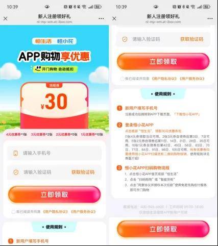 首先,通过恒生活这个H5页面填写手机号就能进行注册,注册成为新用户后,会直接跳转到恒小花APP的下载页面。紧接着,登录恒小花APP,点击APP页面底部的“恒生活”,可以领取30元优惠券。再然后,点击恒小花APP的“扫码购物”或者“智能货柜”,再点击“同意协议并授权本次扣款”,使用免密先购后付服务,即可开始购物,看似是简单的引流,实则可能是为分期商城业务铺路。