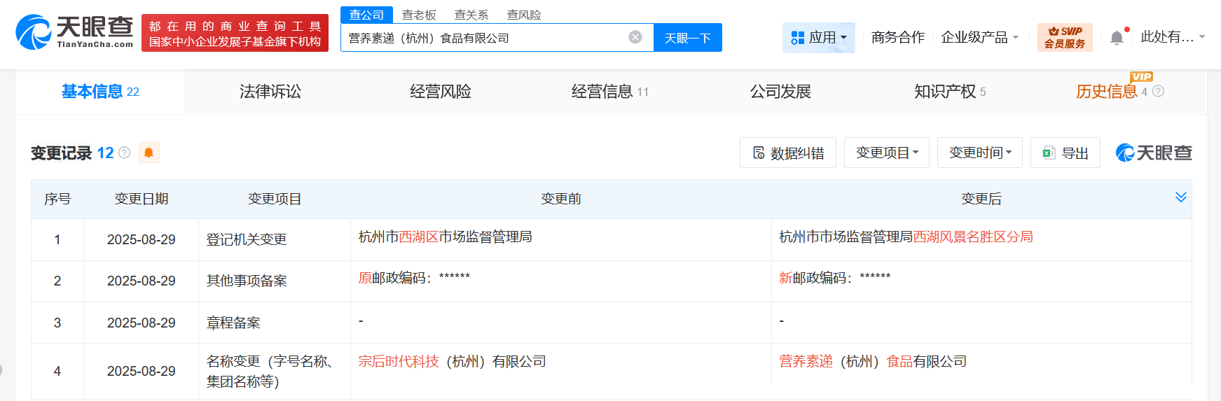 天眼查工商信息显示,近日,宗后时代科技(杭州)有限公司发生工商变更,企业名称变更为营养素递(杭州)食品有限公司。