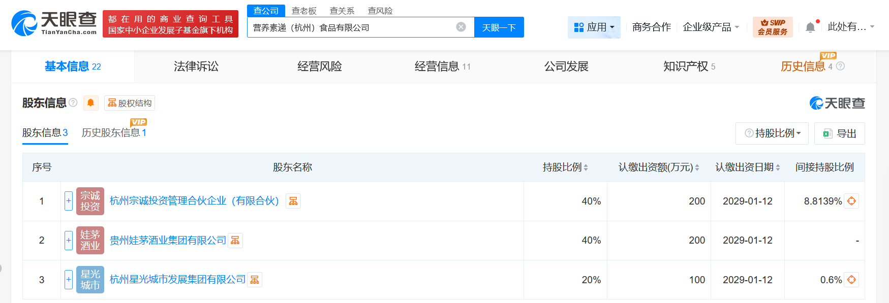 该公司成立于2025年1月,法定代表人为吴坚,注册资本500万人民币,经营范围含食品销售、食品互联网销售、饮料生产、食品生产、食品用塑料包装容器工具制品生产、自动售货机销售、餐饮管理、新能源汽车整车销售等。股东信息显示,该公司由杭州宗诚投资管理合伙企业(有限合伙)、贵州娃茅酒业集团有限公司、杭州星光城市发展集团有限公司共同持股。