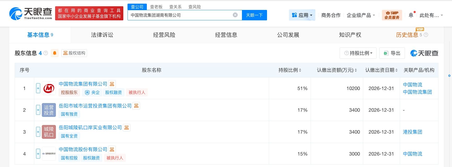 天眼查工商信息显示,近日,中国物流集团湖南有限公司成立,法定代表人为董旭,注册资本2亿人民币,经营范围包括道路货物运输、国内货物运输代理、国际货物运输代理、供应链管理服务等。股东信息显示,该公司由中国物流集团有限公司、中国物流股份有限公司、岳阳市城市运营投资集团有限公司、岳阳城陵矶口岸实业有限公司共同持股。