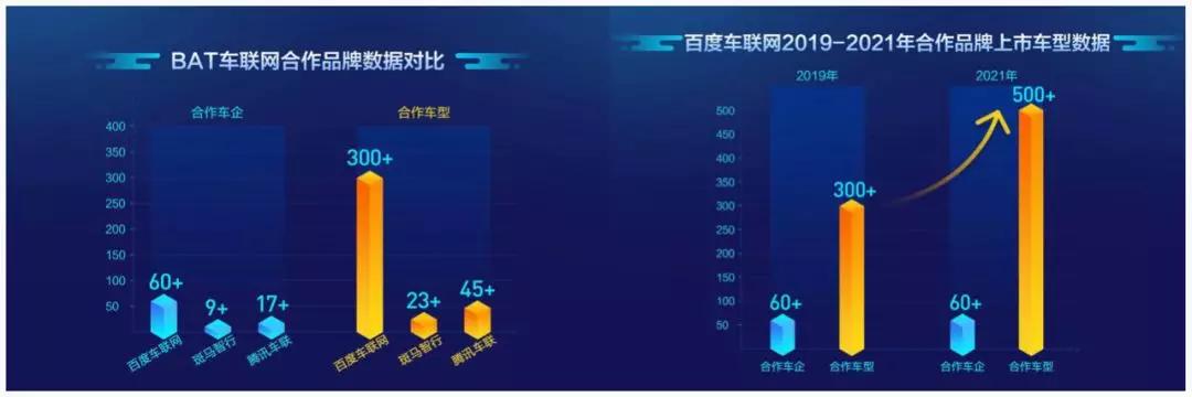 百度车联网目前合作车企达到了60余家,车型达到有300多款,在BAT之间已经实现领跑。