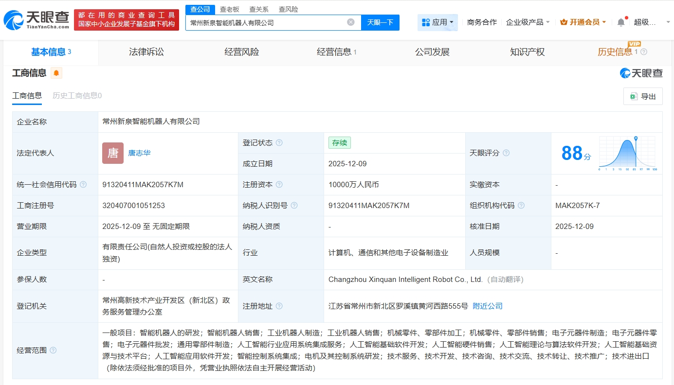天眼查App显示,近日,常州新泉智能机器人有限公司成立,法定代表人为唐志华,注册资本1亿人民币,经营范围包括智能机器人的研发、工业机器人制造、人工智能行业应用系统集成服务、人工智能基础软件开发等。股东信息显示,该公司由新泉股份(603179)全资持股。