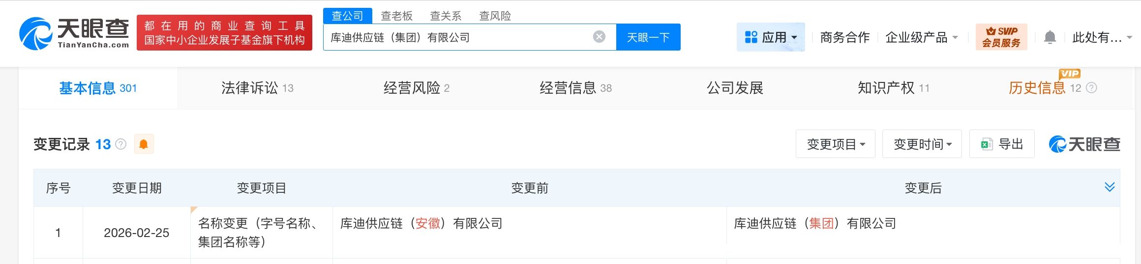 天眼查工商信息显示,近日,库迪供应链(安徽)有限公司发生工商变更,企业名称变更为库迪供应链(集团)有限公司。