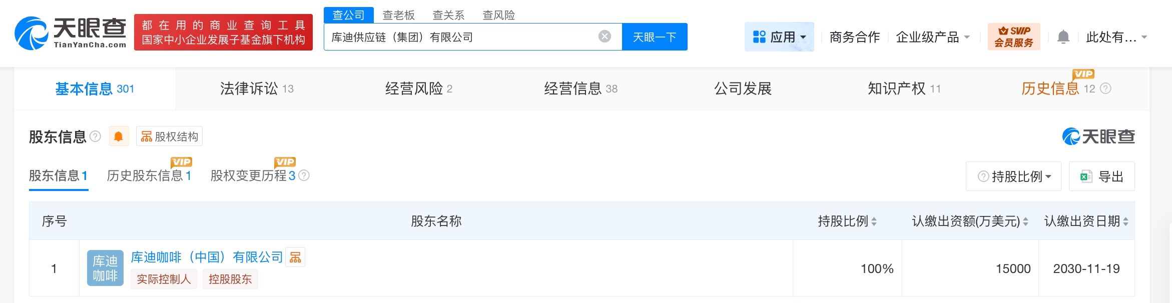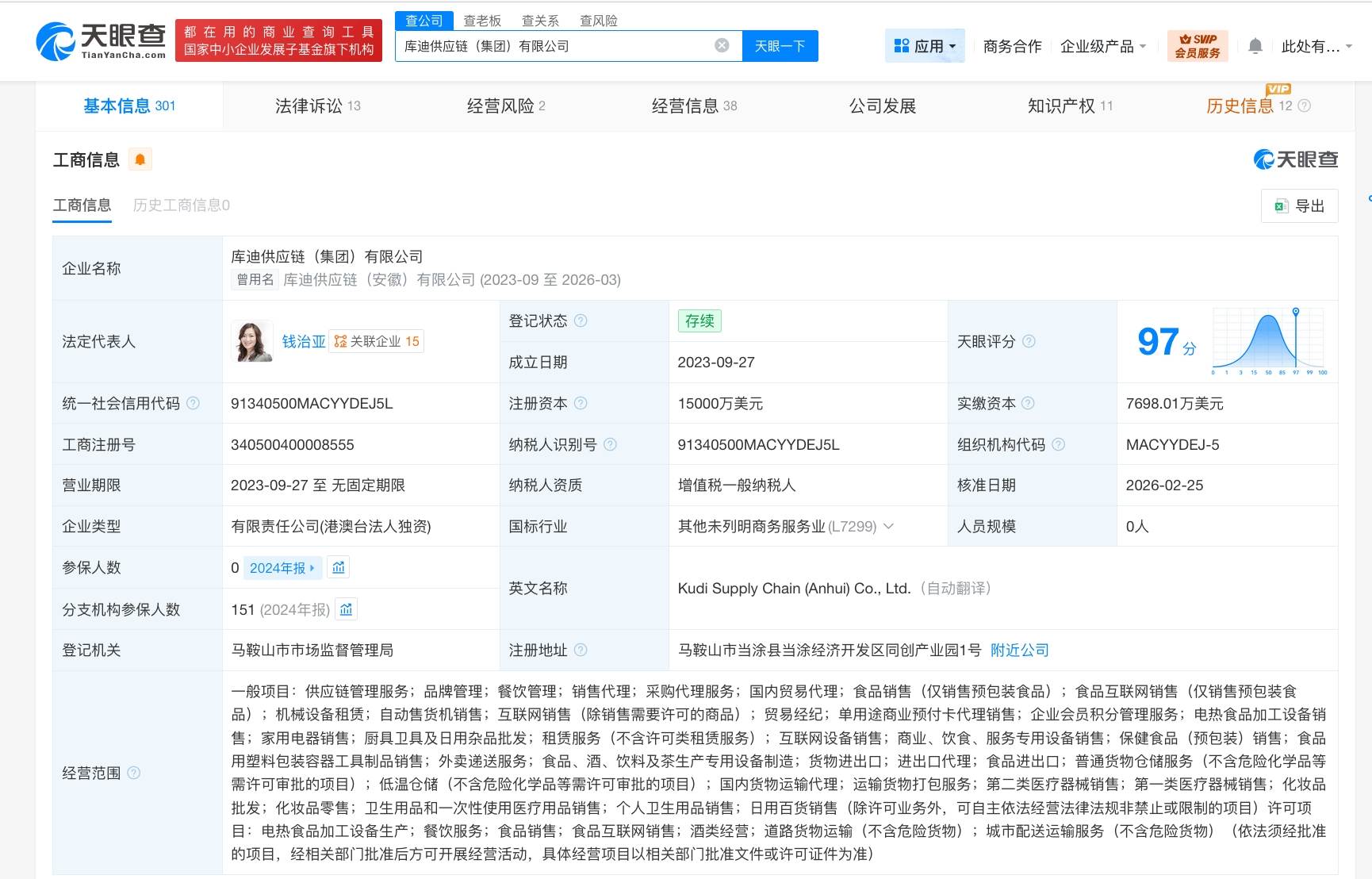 该公司成立于2023年9月,法定代表人为钱治亚,注册资本1.5亿美元,经营范围含供应链管理服务、品牌管理、餐饮管理、采购代理服务、国内贸易代理、食品销售、食品互联网销售、贸易经纪等。股东信息显示,该公司由库迪咖啡(中国)有限公司全资持股。
