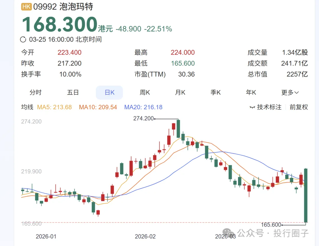 2025年上半年,它还是港股最靓的仔。得益于Labubu在东南亚和北美的病毒式传播,加上“悦己消费”的宏大叙事,股价一路狂飙,年内涨幅一度超过500%,甚至被戏称为“年轻人的茅台”。那时候,分析师们的报告里满是“全球化”、“IP宇宙”、“情绪价值”这些闪闪发光的词汇,目标价一个比一个高,仿佛339港元的高点只是起步价。