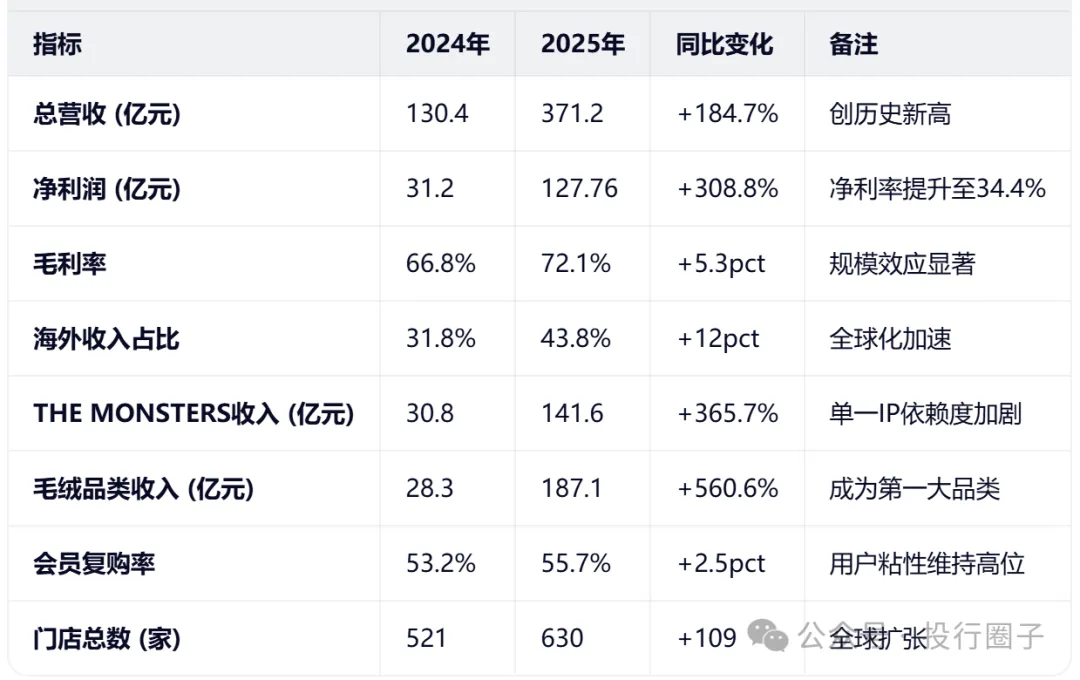 THE MONSTERS系列(主要是Labubu)全年收入141.6亿元,同比增长365.7%,占到了总营收的38%以上。如果算上毛绒品类的187.1亿元收入(其中大部分也是Labubu贡献),这个IP几乎撑起了公司的半壁江山。