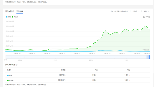安踏曾表示,即将到来的东京奥运会和2022年北京奥运会,将作为拓展品牌向上的制高点,让“安踏”成为国人心智中首选的专业运动品牌。但据百度指数对比,奥运会最近几天不断升温,而安踏却始终不温不火,奥运会似乎并没有对安踏起到什么带动作用。