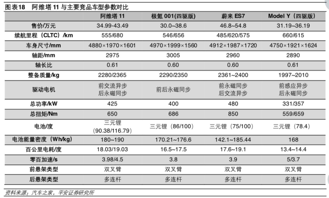 与极氪001、蔚来ES7、特斯拉Model Y、智己LS7、小鹏G9 等同级别车型相比,阿维塔11的智驾能力不容置疑;续航方面,电池容量更大、电池能量密度更高、续航里程更长,加速能力和这些车型也不相上下,可是一到市场上真刀真枪的竞争时,却卖不过友商。
