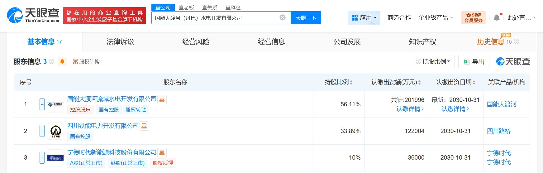 天眼查工商信息显示,近日,国能大渡河(丹巴)水电开发有限公司成立,法定代表人为朱永国,注册资本36亿人民币,经营范围含水力发电,发电业务、输电业务、供(配)电业务,建设工程施工,太阳能发电技术服务,风力发电技术服务,工程管理服务,工程技术服务,以自有资金从事投资活动等。股东信息显示,该公司由国电电力(600795)旗下国能大渡河流域水电开发有限公司、四川铁能电力开发有限公司、宁德时代(300750)共同持股。