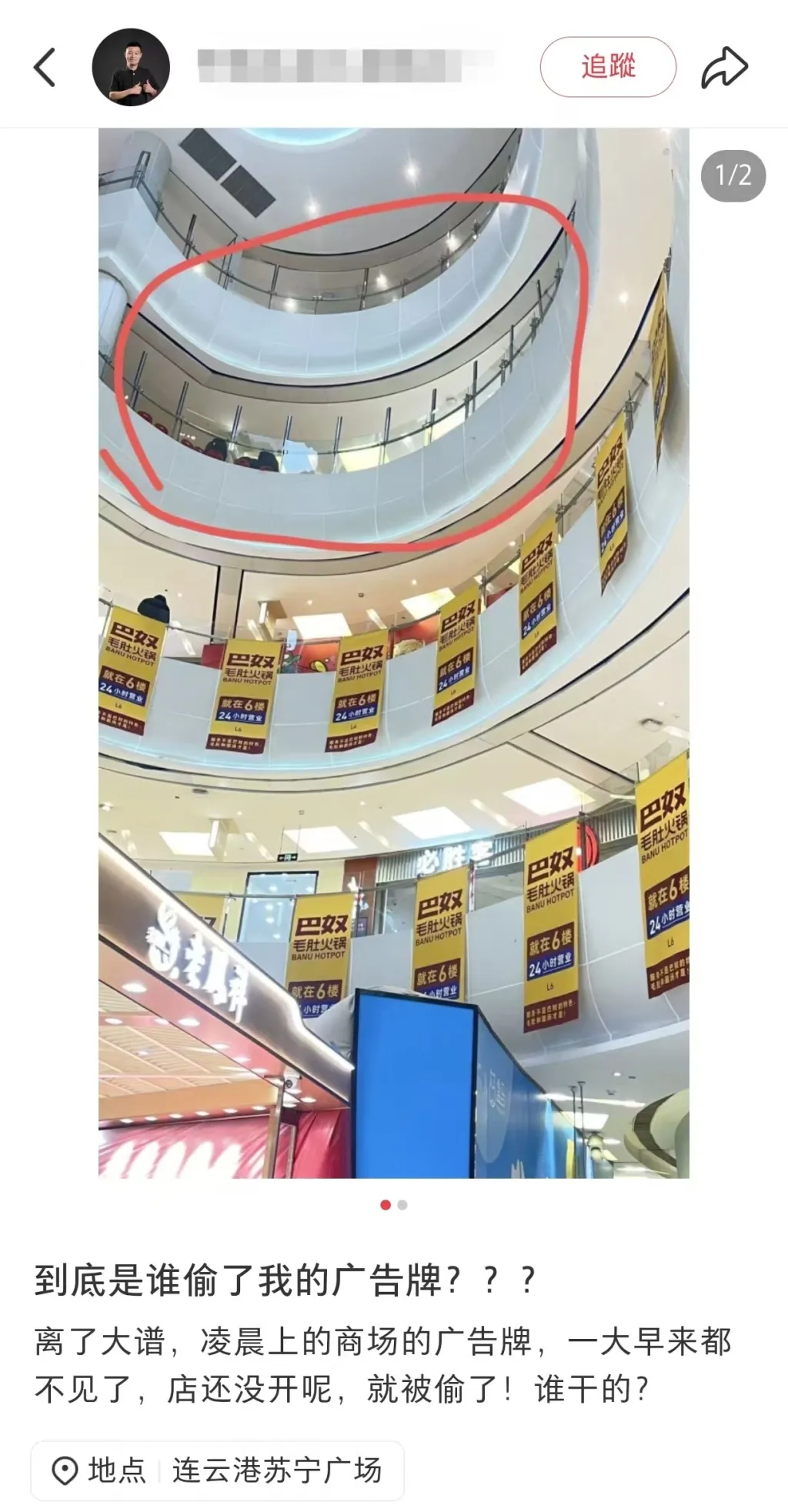 近日,连云港一家尚未开业的巴奴火锅门店广告牌深夜失窃引发关注。该店店长在社交媒体发布的照片显示,此次“失踪”的广告为设置在商场4层和5层的吊旗广告。