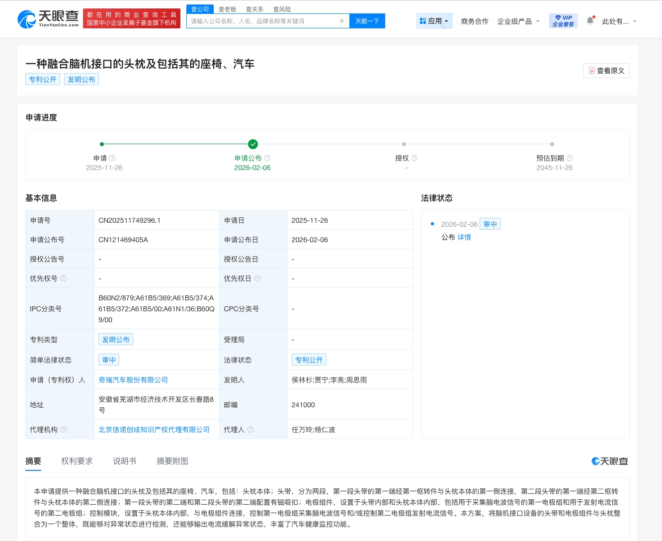天眼查知识产权信息显示,近日,奇瑞汽车股份有限公司申请的“一种融合脑机接口的头枕及包括其的座椅、汽车”专利公布。