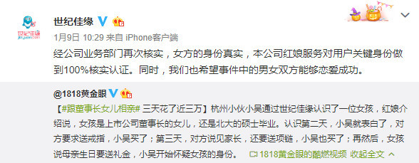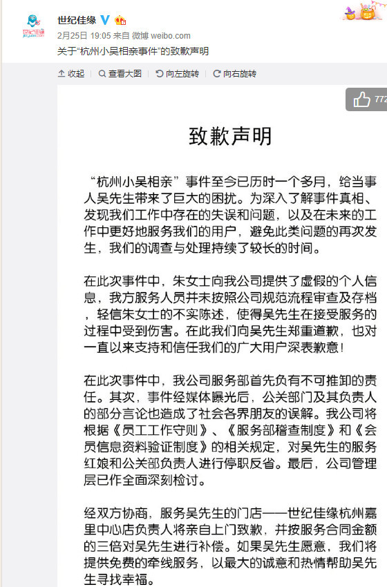 而就在近日,婚恋平台世纪佳缘就摊上事了。一用户吴某通过世纪佳缘相亲,对方推荐了一个女孩,说是北大毕业的,还是上市公司董事长的女儿,三天就花了近三万,小吴觉得有问题。之后更是世纪佳缘先在1月9日发布公告核实确认女方的身份真实,而后在2月25日发布道歉声明,证实自己平台存在失职之处,女方提供的信息确实是造假的。