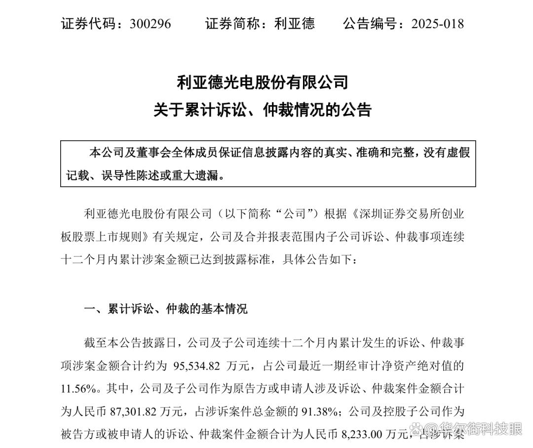 除核心业务增长乏力外,利亚德在文旅夜游板块同样深陷 “回款困局”。根据 3 月 12 日发布的《关于累计诉讼、仲裁情况的公告》,利亚德及其子公司涉诉、仲裁案件涉案总金额高达 9.55 亿元,远超公司同期净亏损规模。值得注意的是,文旅夜游类项目成为引发纠纷的“重灾区”。