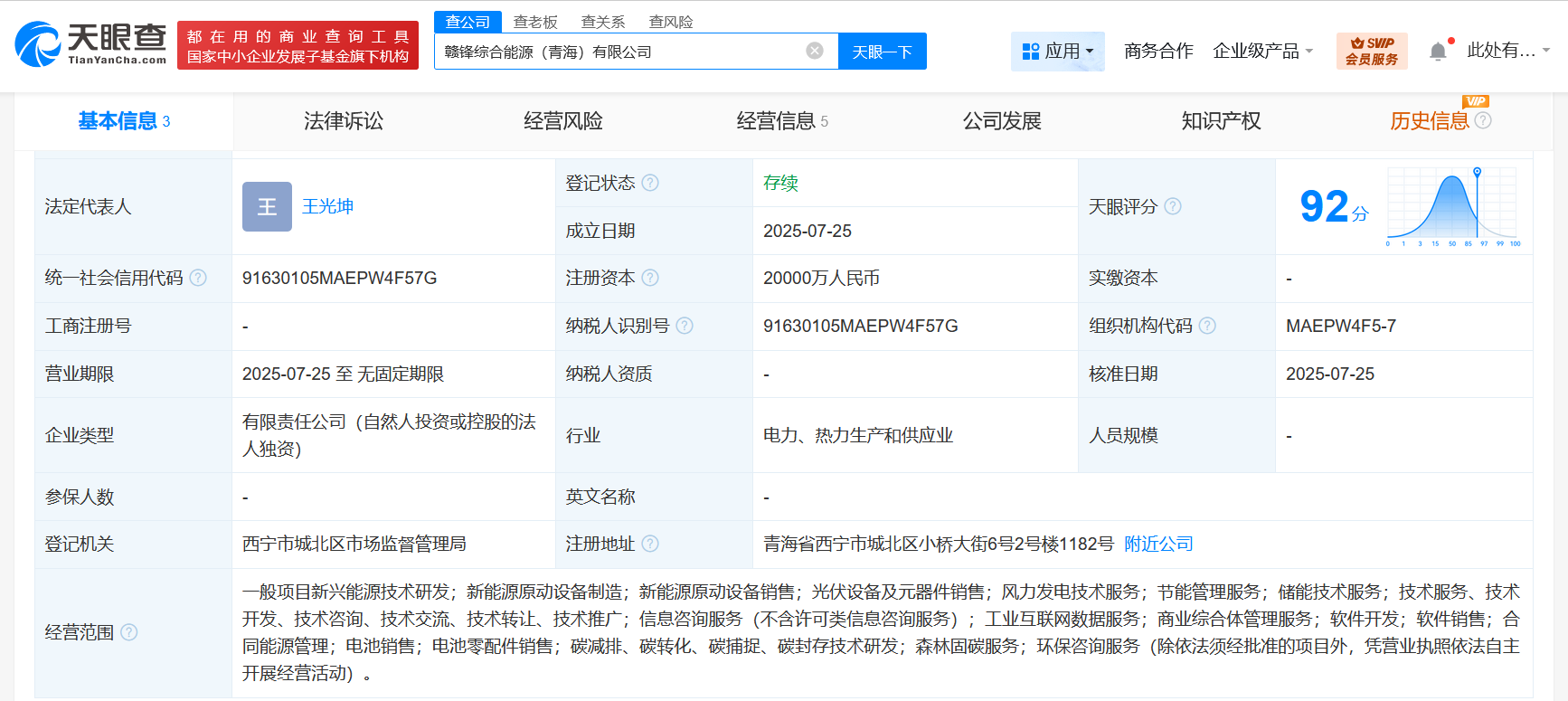 天眼查App显示,近日,赣锋综合能源(青海)有限公司成立,法定代表人为王光坤,注册资本2亿人民币,经营范围含新兴能源技术研发,新能源原动设备制造,新能源原动设备销售,光伏设备及元器件销售,风力发电技术服务,节能管理服务,储能技术服务,碳减排、碳转化、碳捕捉、碳封存技术研发等。股东信息显示,该公司由赣锋锂业(002460)全资持股。