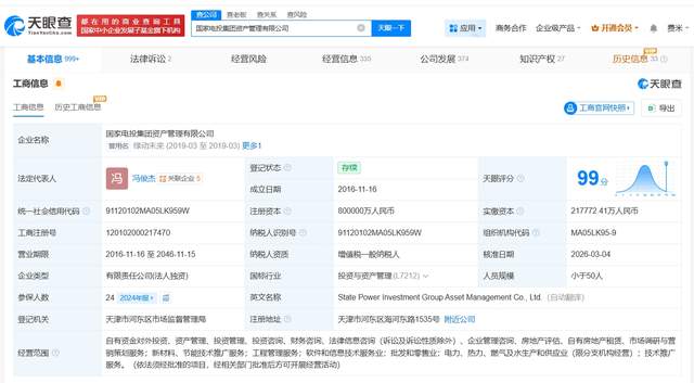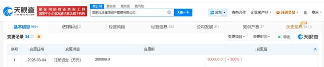 天眼查工商信息显示,近日,国家电投集团资产管理有限公司发生工商变更,注册资本由20亿人民币增至80亿人民币,增幅300%。