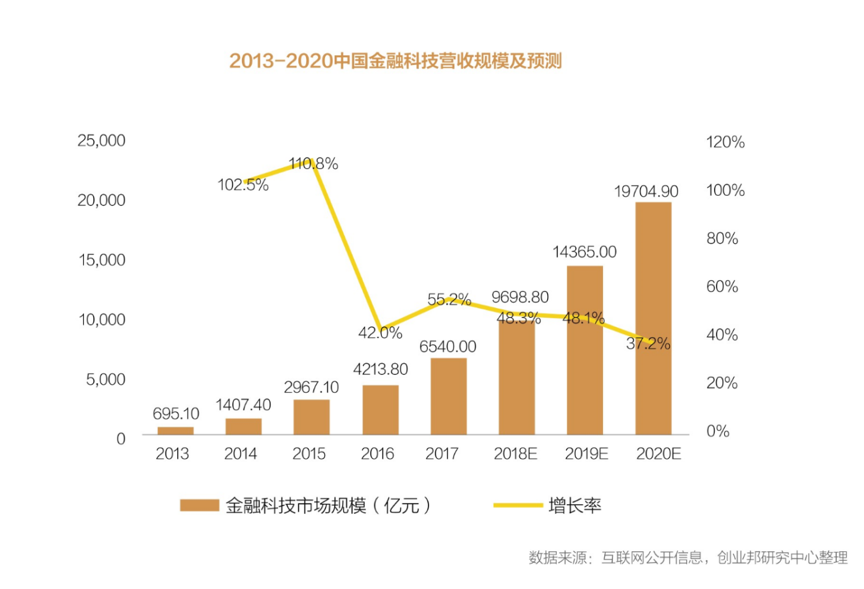 金融科技作为金融业与互联网产业、现代信息技术产业相互融合的产物,正成为当前最具创新活力和增长潜力的新兴业态。根据创业邦研究中心整理,金融科技市场营收规模有望在2020年达到19704.9亿元。