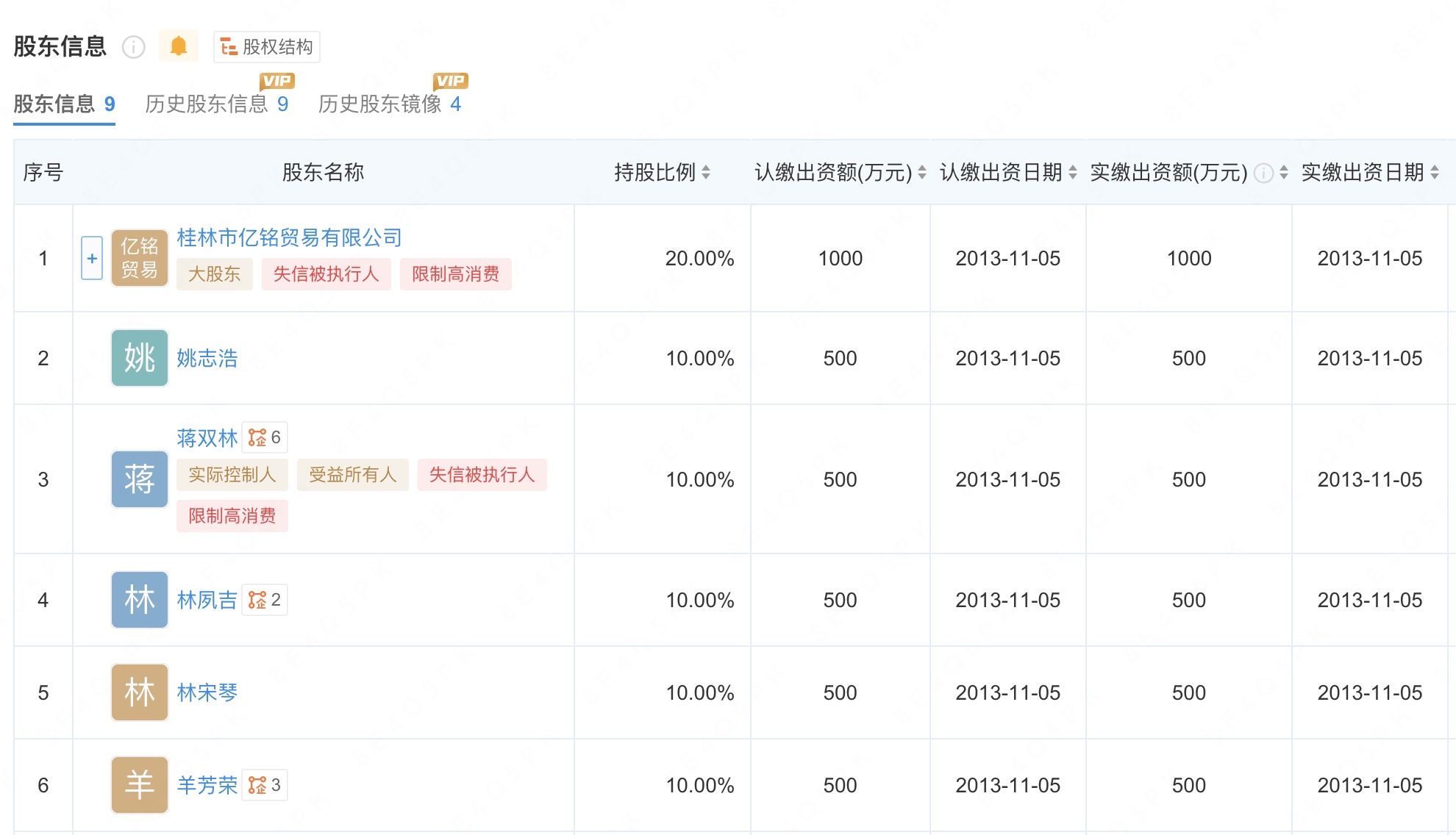 更令人震惊的发现在于这家小贷公司背后的资本构成。从企查查通过股权穿透,同正旭宁小贷的第一大股东桂林市亿铭贸易有限公司的实际控制人蒋双林,已经被列入全国失信被执行人名单——这在民间俗称为“老赖”。这意味着,一个因欠债被法院强制执行、拒不履行债务的自然人,却在通过其控制的商业实体大规模从事金融借贷业务。