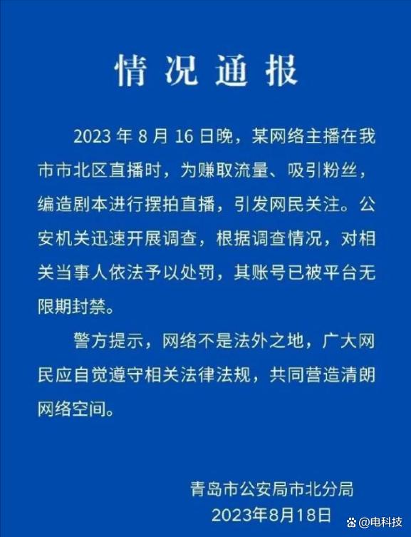 不过,剧情反转来得突然,8月18日,青岛市公安局市北分局通报,这起闹剧纯属“编造剧本进行摆拍直播”,目的是“赚取流量、吸引粉丝”。公安机关已经根据调查情况对相关当事人依法予以处罚,其账号已被平台无限期封禁。
