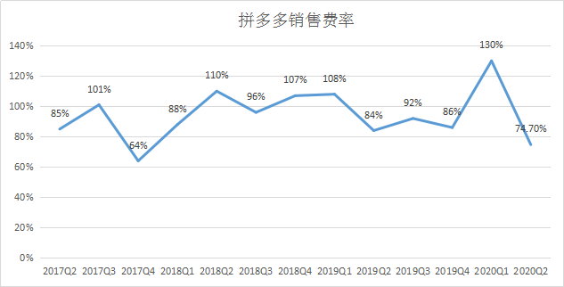 与此相对应的是几个方面的数据快速上升,比如年活跃买家、GMV、营收等,这几年间发展速度都算不错。但从营销费率(即市场营销费用占销售额的比例)的曲线图来看,拼多多一直保持着一个很高的数字,也就说,1元钱的投入也就拉动1一元多点的收入,过去四年间超过100%的五个季度里,一元钱的投入甚至收不回一元钱。