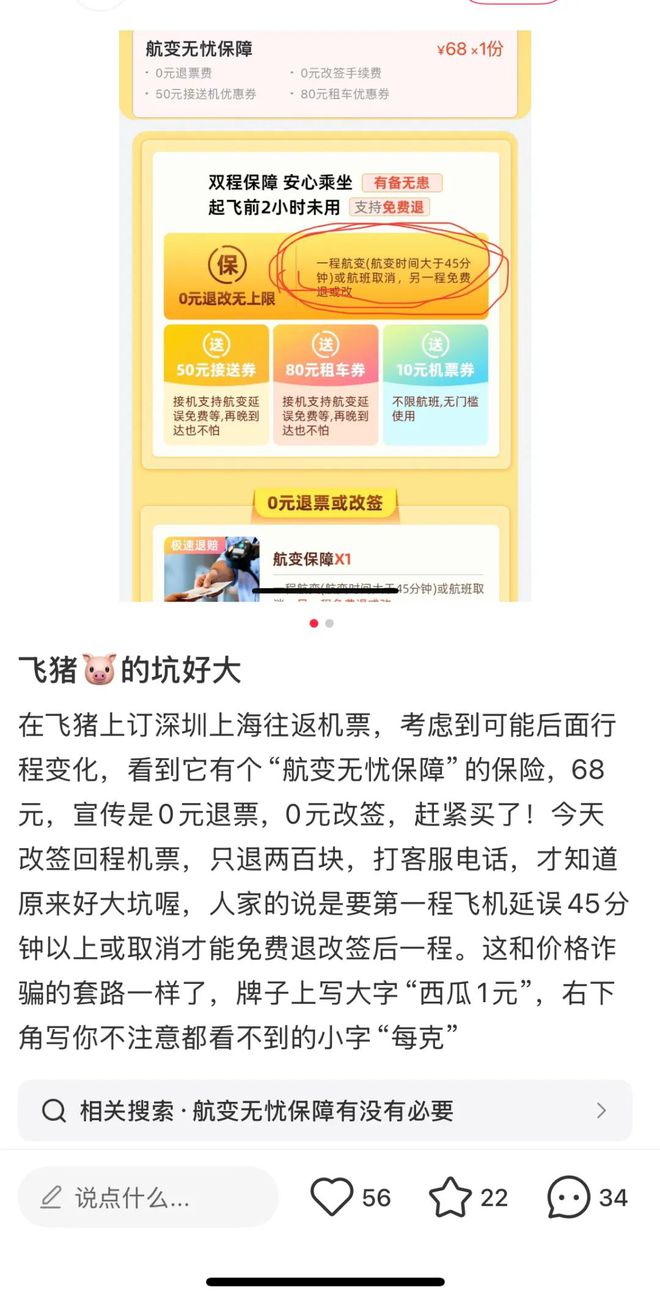 网友反应,在飞猪上订购往返机票,并购买“航变无忧”保险,宣传是0元退票0元改签,而当他改动回程机票时,却并未实现0元退改,客服电告知需要满足第一程飞机延误 45分钟以上或取消才能免费退改签后一程。