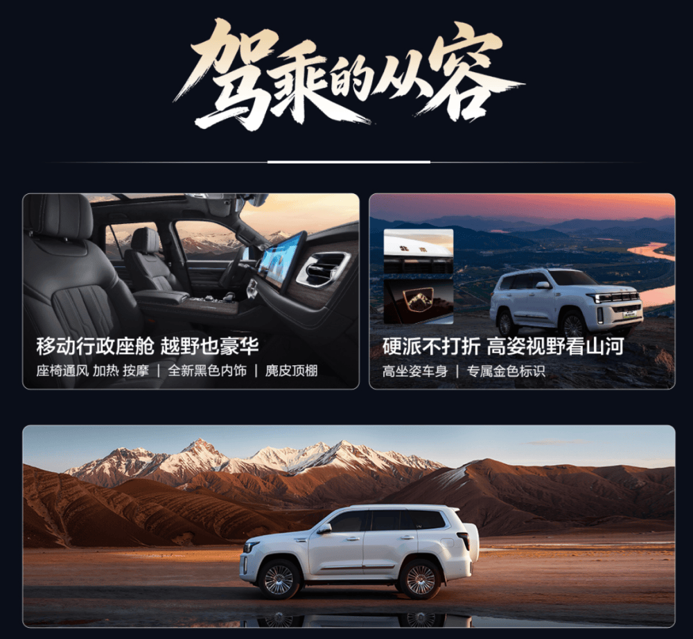 第三,驾乘的从容:全维度豪华硬派实力。新车延续经典硬派造型,融入专属金色标识。动力上搭载1.5T高效增程器,实现152km纯电续航与1200km综合续航,WLTC综合油耗低至1.43升。以非承载式车身为基础,打造“智电四驱+中锁+后桥机械差速锁”三重全域驱动,配合11种ATS全地形模式,轻松应对100%坡度与800毫米涉水深度。具备12挡蠕行模式与战术掉头功能。配备通风、加热、按摩,结合麂皮包覆顶棚与256色氛围灯,将行政级豪华氛围拉满。首创越野六联屏智能座舱,搭载高通8155芯片与AI语音助手,华为生态无缝接入,再配合AI能量管理大师,组成了越野智能的“全家桶”。安全方面,依托行业首创“太极底盘”配合96%超高强度钢车架,铸就钢筋铁骨;“极光电池系统”实现1200℃高温高温隔绝、1500J抗冲击与IP68最高等级防护。